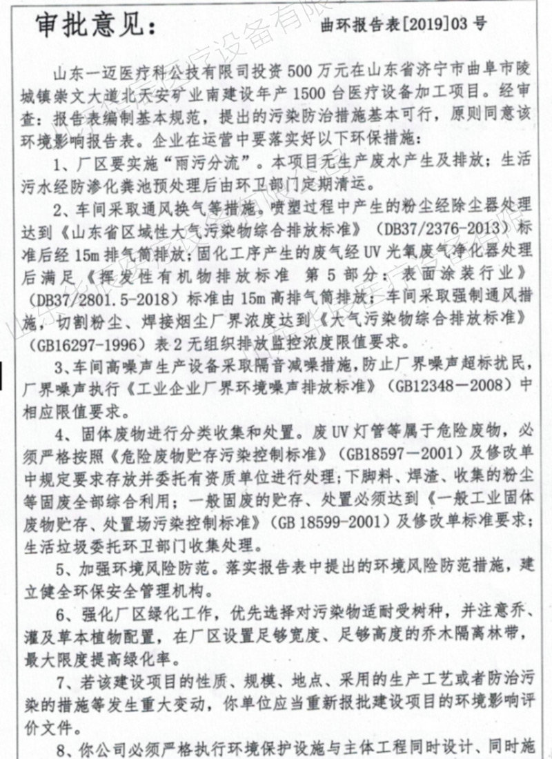 (2)曲阜市環(huán)境保護(hù)局對(duì)山東華辰醫(yī)療設(shè)備有限公司年產(chǎn)1500臺(tái)醫(yī)療設(shè)備加工項(xiàng)目的審批意見【曲環(huán)報(bào)告表[2019]03號(hào)】(2019.01.08);