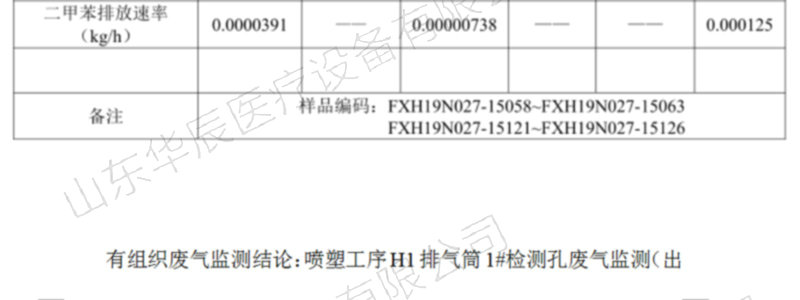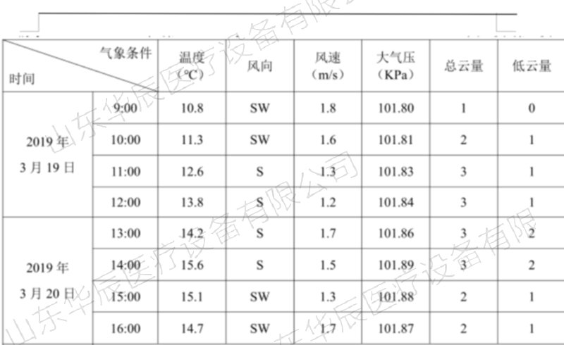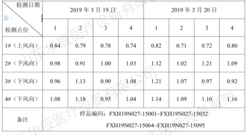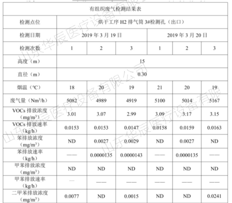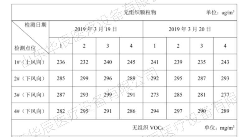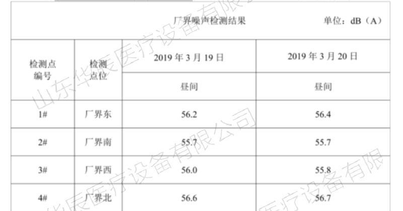山東華辰醫(yī)療設(shè)備有限公司委托山東方信環(huán)境檢測(cè)有限公司2019年3月19日~2019年3月20日對(duì)該企業(yè)廢氣、噪聲進(jìn)行了檢測(cè),檢測(cè)期間主體工程工況穩(wěn)定,環(huán)保設(shè)施運(yùn)行正常。