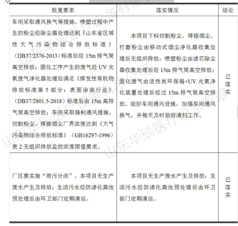 2019年05月12日,山東華辰醫(yī)療設(shè)備有限公司根據(jù)山東華辰醫(yī)療設(shè)備有限公司年產(chǎn)1500臺(tái)醫(yī)療設(shè)備加工項(xiàng)目竣工環(huán)境保護(hù)驗(yàn)收監(jiān)測(cè)報(bào)告,對(duì)照《建設(shè)項(xiàng)目竣工環(huán)境保護(hù)驗(yàn)收技術(shù)規(guī)范/指南》,嚴(yán)格依照國(guó)家有關(guān)法律法規(guī)、建設(shè)項(xiàng)目竣工環(huán)境保護(hù)驗(yàn)收技術(shù)規(guī)范、本項(xiàng)目環(huán)境影響評(píng)價(jià)報(bào)告表和審批部門審批決定等要求對(duì)本項(xiàng)目進(jìn)行驗(yàn)收,提出意見如下: