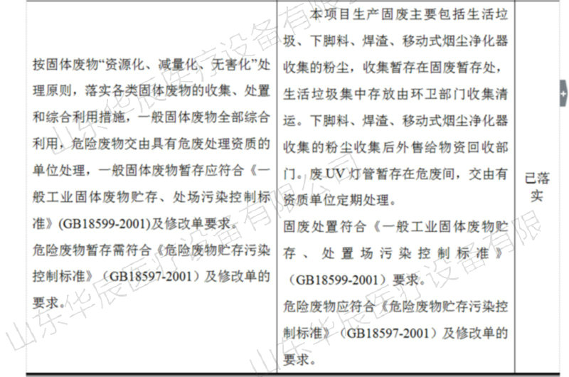 (6)固體廢物臨時(shí)貯存執(zhí)行《一般工業(yè)固體廢物貯存、處置場(chǎng)污染控制標(biāo)準(zhǔn)》(GB 18599-2001)及修改單(環(huán)保部公告2013年第36號(hào))要求、危險(xiǎn)廢物臨時(shí)貯存執(zhí)行《危險(xiǎn)廢物貯存污染控制標(biāo)準(zhǔn)》(GB 18597-2001)及其修改單。