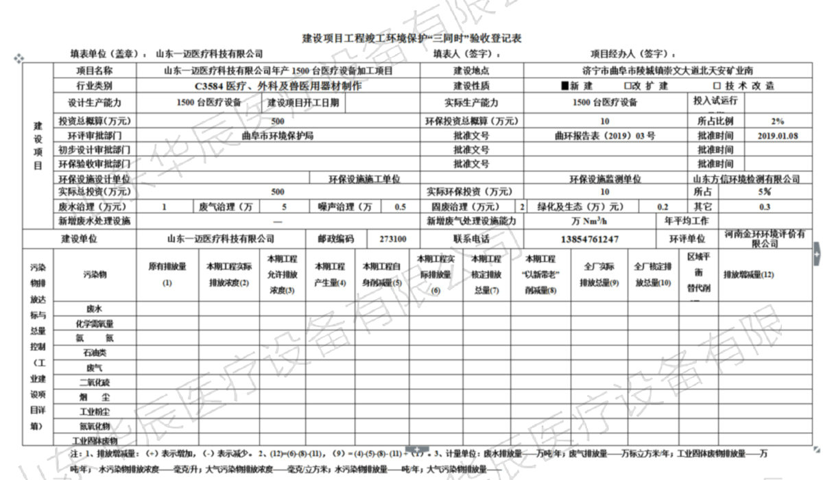 2018年12月,山東華辰醫(yī)療設(shè)備有限公司委托河南金環(huán)環(huán)境影響評(píng)價(jià)有限公司編制了《山東華辰醫(yī)療設(shè)備有限公司年產(chǎn)1500臺(tái)醫(yī)療設(shè)備加工項(xiàng)目環(huán)境影響報(bào)告表》,2019年01月08日,曲阜市環(huán)保局對(duì)該項(xiàng)目進(jìn)行了批復(fù)(曲環(huán)報(bào)告表【2019】03號(hào))。